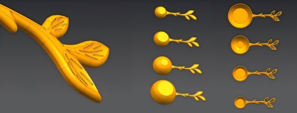 Αρχικά, περιελάμβανε την αξιολόγηση του σχήματος και της πιθανής χρήσης του προϊόντος με βάση την προηγούμενη εμπειρία. Χρησιμοποιώντας κράμα ψευδάργυρου ως κύριο υλικό, υπολογίσαμε την πυκνότητα του υλικού και τα χαρακτηριστικά επιφάνειας, ενσωματώσαμε εργονομία και σχεδιάσαμε τις συνολικές διαστάσεις για τα τέσσερα κουτάλια μέτρησης ή τα κουτάλια πάγου. Στη συνέχεια, βελτιώσαμε κάθε καμπύλη, αυτές τις λεπτομέρειες με βάση άλλες μικρές διαστάσεις γωνίες και άλλες γωνίες ακτίνας R.