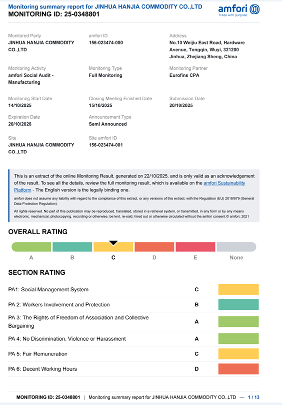Η Jinhua Hanjia commodity Co., Ltd. δημοσίευσε τα αποτελέσματα του ελέγχου BSCI. Στις 14 Οκτωβρίου, η εταιρεία πέρασε με επιτυχία την επαγγελματική αξιολόγηση και έλαβε πιστοποίηση Κατηγορίας C, η οποία πληροί την ελάχιστη απαίτηση που καθορίζεται από τον πελάτη. Η περίοδος ισχύος αυτής της πιστοποίησης είναι ένα έτος. Ο έλεγχος BSCI επιλέχθηκε από τον πελάτη EUROFINS. ανοιχτήρια, αξεσουάρ κρασιού και προϊόντα από ανοξείδωτο χάλυβα, όπως σέικερ κοκτέιλ από την εταιρεία μας εδώ και πολύ καιρό. Η χώρα του πελάτη απαιτεί από τους προμηθευτές να διαθέτουν αυτήν την πιστοποίηση.
