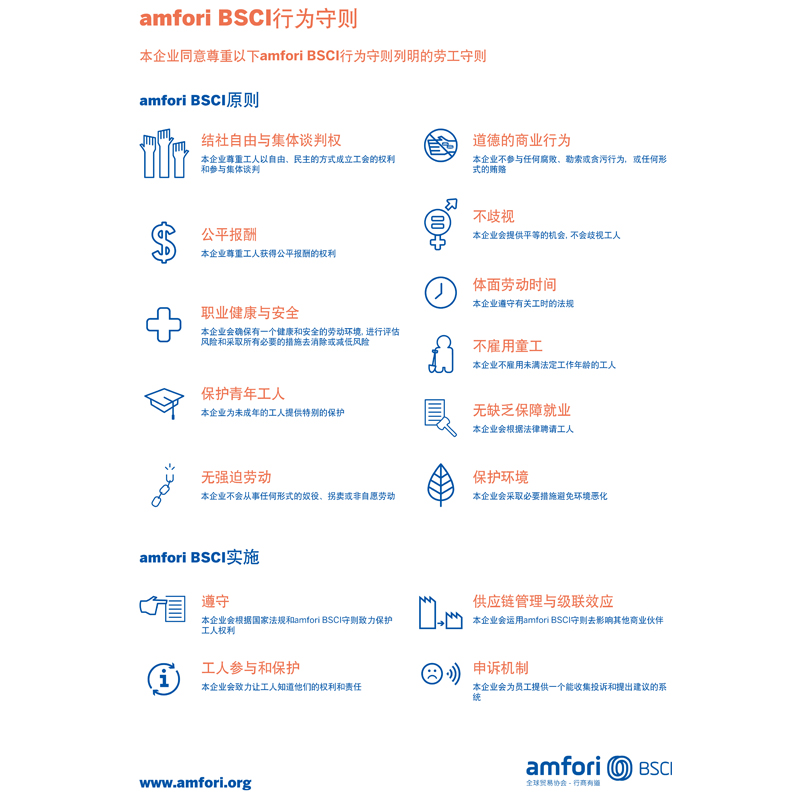 Σύμφωνα με τις απαιτήσεις των κανονισμών της BSCI, η εταιρεία μας θα τηρεί αυστηρά τις κατευθυντήριες γραμμές εργασίας που περιγράφονται στον Κώδικα Δεοντολογίας Amfori BSCI για να διασφαλίσει την αποτελεσματική εφαρμογή των αρχών της BSCI. λαμβάνουν δίκαιες εργασιακές πρακτικές και αποζημίωση. Επιπλέον, εγγυόμαστε ότι οι εργαζόμενοι έχουν αξιοπρεπείς ώρες εργασίας και άλλα θεμελιώδη δικαιώματα.